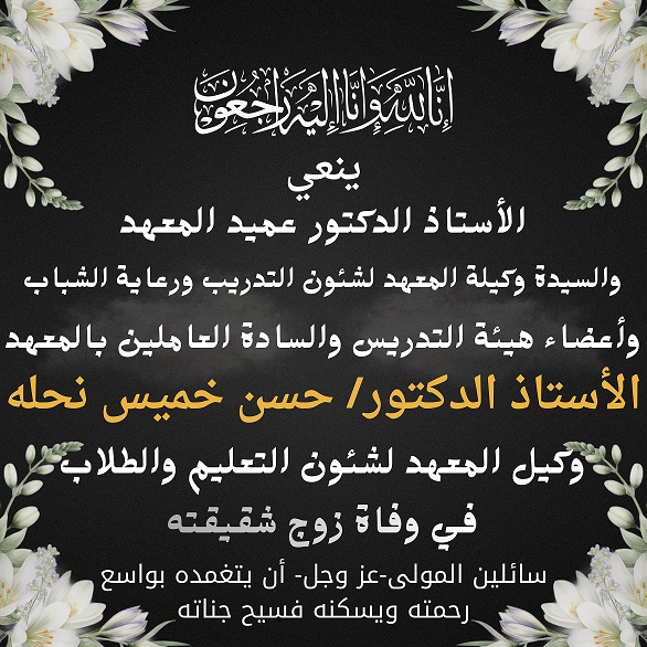 السيد الأستاذ الدكتور عميد المعهد والسيدة وكيلة المعهد لشئون التدريب ورعاية الشباب والسادة أعضاء هيئة التدريس والعاملين بالمعهد يتقدمون بخالص التعازي والمواساة القلبية للأستاذ الدكتور/ حسن خميس نحلة وكيل المعهد لشئون التعليم والطلاب فى وفاة زوج شقيقته ، للفقيد الرحمة وللأسرة والأحباب الصبر والسلوان.