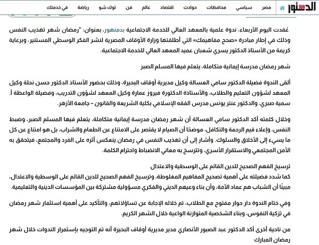 حاضر فى الندوة فضيلة الشيخ الدكتور/ سامي عوض العساله وكيل وزارة الأوقاف بالبحيرة ، فضيلة الدكتور/ عنتر يونس مدرس الشريعة الإسلامية بكلية الشريعة والقانون جامعة الأزهر ، الداعية الإسلامية الأستاذة / سمية صبري واعظ ديني بوزارة الأوقاف .